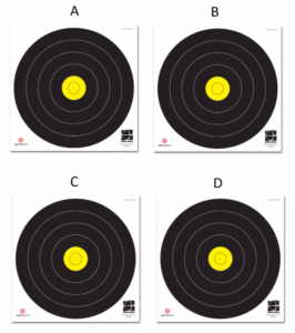 Vid 40 cm-tavlorna är fyra tavlor uppsatta i en fyrkant. Varje tavla är märkt med bokstäverna A, B, C eller D, och varje skytt skjuter på sin tilldelade tavla: